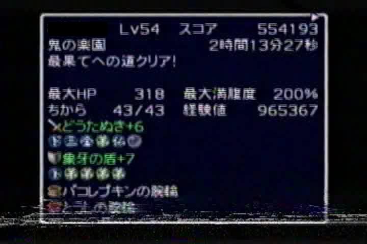 限界まで100万ギタンを持ちつつ微妙に差をつけて可能な限りのハイスコアをという計画で値段の高い草効果の壷や幸の印をなるべく採用し、アイテムが拾えなくてもいい様にシハンを絶滅させた上で盾にサの印もつけたのに最後の最後に店でミスってしまい後悔は大きいです。終盤罠は出ないとはいえ割れる壷が三つあり転ばしの土偶が怖かったですが無事最後までたどり着くことは出来ました。