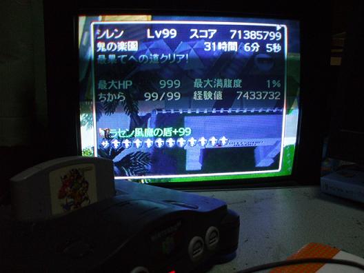54階でイアイをレベルアップさせたシハンをねだやして、後半の不安を消去。59階で龍神剣に火印を入れることを思いついたのですが印が埋まっていたのでベースを泣く泣くスパークソードに代えて天、回、仏が消える・・・。65階の店で100万ギタンを129個に増やしマル父とお別れ。70階の店で100万ギタンが133個、74階でギタンの土偶が出たので大部屋の巻物+ワナけしの巻物を使用、ギタンを稼ぐ。77階の最後のお店で100万ギタンを137個、更に所持金を999999ギタンにして、後は慎重にギタンを拾わないようにしてクリア!アイテムの限界数には届きませんでしたが、そのおかげで77階以降おにぎりが床落ちで出ることがあったので助かりました。