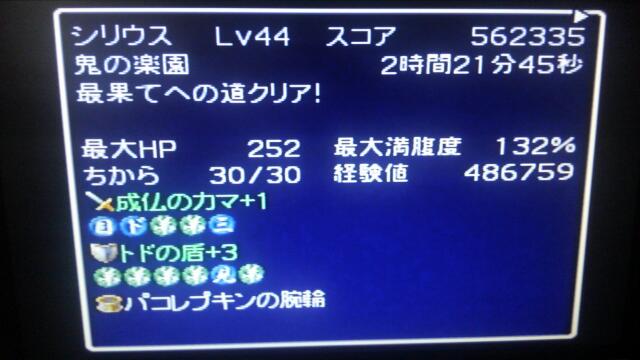 アイテムに恵まれず、パコレプキンの腕輪も中盤にやっと変化で入手。黄金の間にも行きましたが、剣が拾えず。ですが、どうにか完走できました。