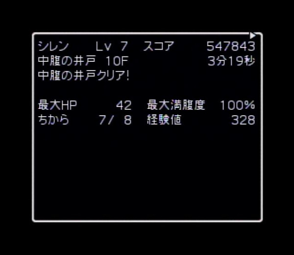 序盤にlv上げを試みるも一方通行やレンサのワナなどの稼ぎのワナがほどんど出なかったので、10Fでlv27くらいでそのまま進めていきました。