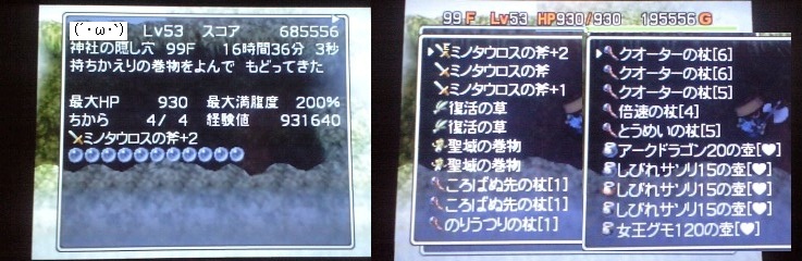 画像は、クリア・99Fのアイテム・挑戦前・1Fのアイテムを結合しました。