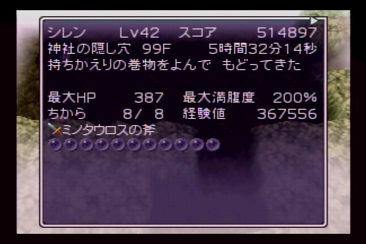 それ以降は、階段を降りた直後のダイレップウさえ凌げればそれほど苦ではなかったのですが、99Fで大洪水の罠→たまらんガッパのコンボにより持ち帰りの巻物が消滅…。