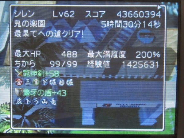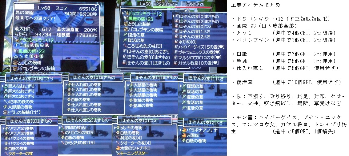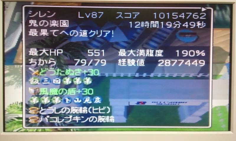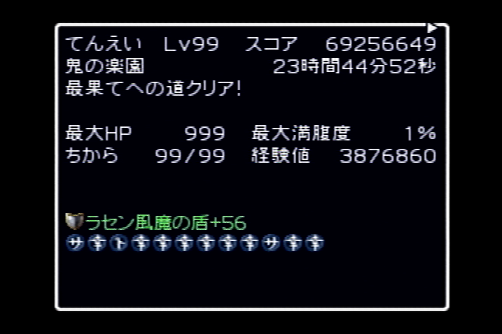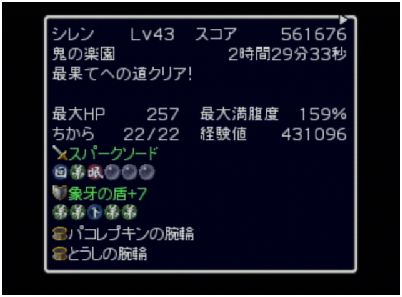 殆どの階で長居してアイテム稼いでたので、当然ながら平凡なタイムとスコアです・・・。