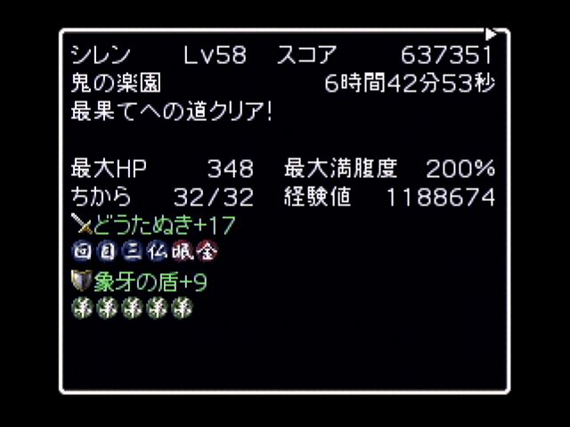 限界まで100万ギタンを持ちつつ微妙に差をつけて可能な限りのハイスコアをという計画で値段の高い草効果の壷や幸の印をなるべく採用し、アイテムが拾えなくてもいい様にシハンを絶滅させた上で盾にサの印もつけたのに最後の最後に店でミスってしまい後悔は大きいです。終盤罠は出ないとはいえ割れる壷が三つあり転ばしの土偶が怖かったですが無事最後までたどり着くことは出来ました。